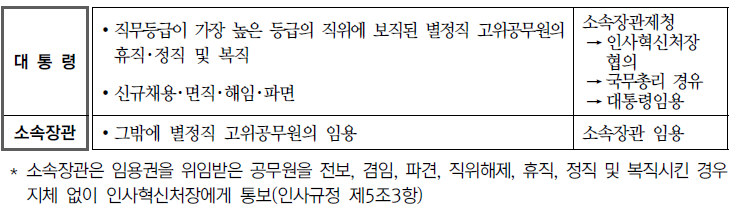 ○ 고위공무원에 대한 임용권은 일부 예외적으로 소속장관에게 위임된 사항을 제외한 일체의 임용권이 대통령에 속함