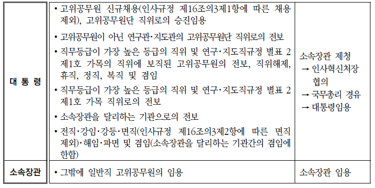 연구직・지도직 고위공무원의 신규채용・전직・강임・면직・해임・파면, 직위해제・휴직・ 정직・복직, 부처내 전보・겸임 및 파견은 소속장관이 행사