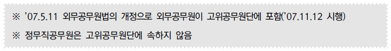 ○ 고위공무원단은 고위공무원단 직위에 재직 중이거나 파견・휴직 등으로 인사관리 되고 있는 일반직공무원, 별정직공무원 및 특정직공무원의 군을 말하는 바, 이를 통칭하여 “고위공무원단에 속하는 공무원”(이하 “고위공무원”이라 함)이라 함