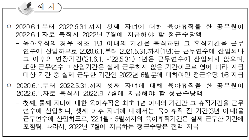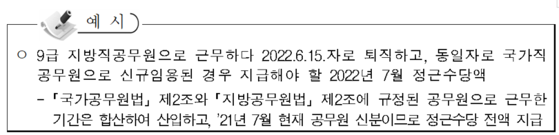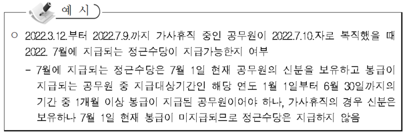 -예컨대, 7월 11일자로 7급에서 6급으로 승진한 경우 7월의 정근수당은 7월 1일 당시의 직급・호봉(7급에서의 해당 호봉)에 상응하는 월봉급액을 기준으로 지급함