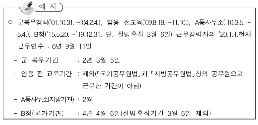 *예컨대, 징계처분 종료 후 근무연수에 산입하지 않는 기간(영창・근신 또는 견책 : 6개월, 감봉 : 12개월, 강등・정직 : 18개월)은 일정기간(영창・근신 또는 견책 : 3년, 감봉 : 5년, 정직 : 7년, 강등 9년)이 경과하면 근무연수에 산입(이 경우에도 강등에 따라 직무에 종사하지 못하는 3개월, 정직기간, 감봉기간 등 징계처분기간은 계속 산입하지 아니한다)하며, 국제기구・외국기관・국내외 대학・국내외 연구기관・재외국민연구기관・다른 국가기관・민간기업 그 밖의 기관에서 근무하기 위한 휴직, 외국 유학휴직 및 육아휴직(휴직기간 중 최초 1년 이내의 기간, 다만, 셋째이후 자녀에 대한 휴직에 대해서는 전 기간) 등은 복직하면 그 휴직기간을 근무연수에 산입함