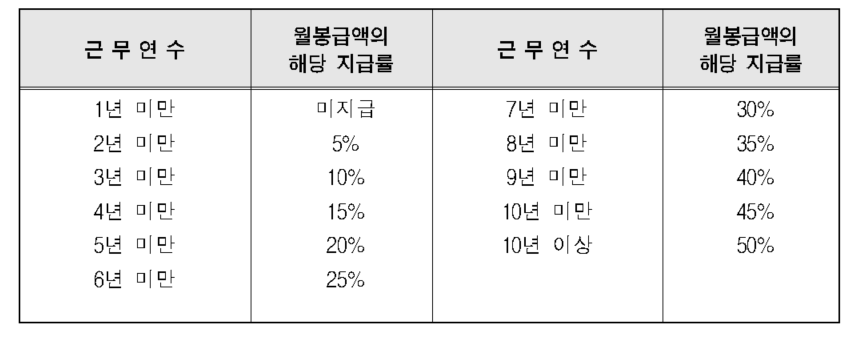 라. 지급액 : 근무연수에 따라 월봉급액의 0%에서 50%까지 차등 지급(영 별표 2)