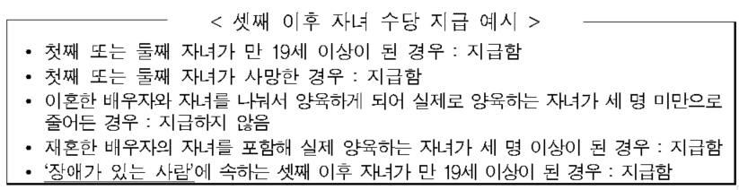 라)“셋째 이후 자녀”란 해당 공무원의 자녀 중 셋째 이후 자녀로서 가족수당 대상자(만 19세 미만)에 해당된 자녀이며, 가족관계증명서 등을 통해 셋째 이후 자녀임을 확인해야 한다.