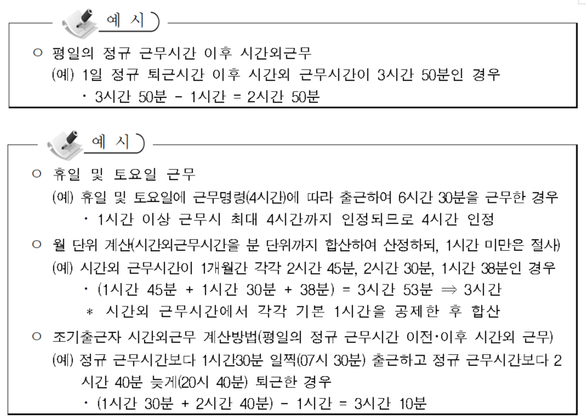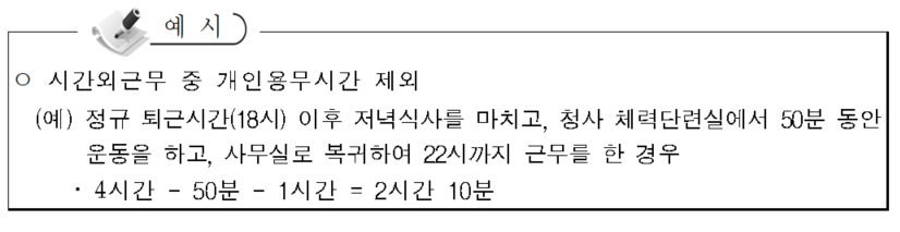개인용무시간을 제외하고 1일 1시간 이상 실제 본연의 업무에 대한 시간외근무를 한 경우에 한하여 시간외근무를 인정하며, 시간외근무시간 산정시에는 개인용무시간을 제외한다. 다만, 정규근무시간외 개인용무 사용은 1일 정규근무시간 전・후 각 1회로 제한한다(단, 토요일 및 휴일의 경우 개인용무 사용은 1일 1회로 제한한다).