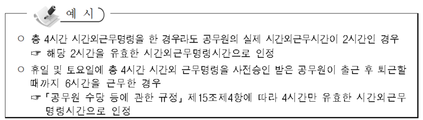 *(예시) 총 4시간의 시간외근무명령을 발령한 경우라도 공무원의 실제 시간외근무시간이 2시간인 경우에는 해당 2시간을 유효한 시간외근무명령 발령시간으로 산정. 따라서 1일 4시간씩 20일 동안 시간외근무명령이 발령되었더라도 실제 시간외근무시간이 40시간(월)이라면 해당 공무원에 대한 잔여 시간외근무명령 발령시간은 17시간임