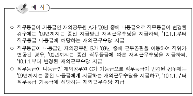(가)’09.1.1. 현재 고위공무원(3급 이상, 9등급 이상, 중령 이상 포함) 및 해당계급(직무등급)에 임용되는 공무원은 ’09.12.31.까지는 종전 수당규정(대통령령 제21078호(2008.10.8.)) 별표 11 제5호가목(재외근무수당)에 규정된 금액을 지급하되, ’09년도에 직무등급이 가등급인 직위에 처음으로 임용되는 공무원은 종전 (나)등급 지급 금액을, 나등급인 직위에 처음으로 임용되는 공무원은 종전 (마)등급에 해당하는 금액을 ’09.12.31.까지 지급