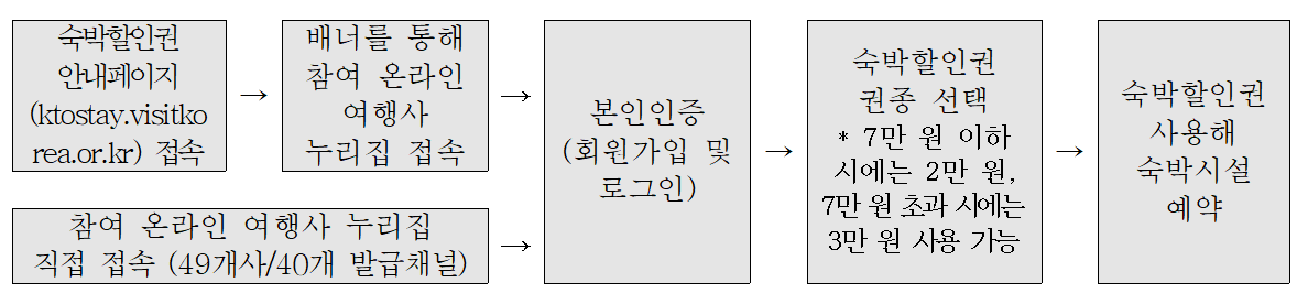 문체부는 지난해 11~12월에 지역관광을 활성화하기 위해 78만여 명을 대상으로 숙박할인권을 발급했고, 이는 매출액 944억 원, 여행소비액 3,108억 원으로 이어져 내수경기 진작에 크게 기여했다. 올해도 온라인여행사 총 49곳을 통해 국내 숙박시설을 예약할 때 2~3만 원을 할인받을 수 있는 숙박할인권을 제공한다.