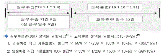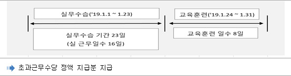 ② 실무수습 받은 기간이 15일 미만, 그 외 교육훈련 : 실무수습일 일할지급 + 15일 중 나머지 기간에 대해서는 교육훈련시의 봉급액을 기준으로 일할지급