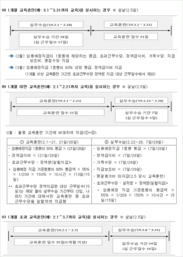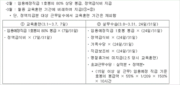 - 단, 교육훈련(실무수습 도중 교육훈련을 실시하는 경우를 포함한다)의 경우 임용예정 직급 1호봉에 해당하는 봉급의 80%와 초과근무수당, 정액급식비만 지급함