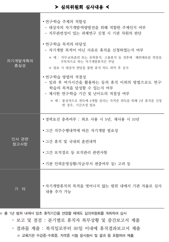 심사・승인 : 내부 심의위원회에서 자기개발계획의 충실성, 그간 직무수행내역, 보직경로, 기관 인력운영상황 등을 고려하여 심사