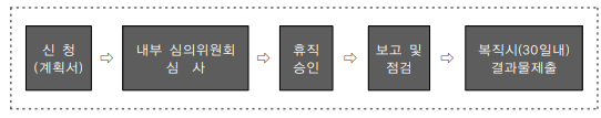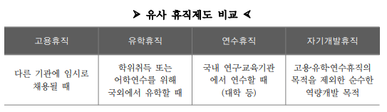 대통령령등으로 정하는 기간(5년)동안 재직한 공무원이 직무 관련 연구과제수행 또는 자기개발을 위하여 학습・연구 등을 하게 된 때 직무와 관련있는 연구과제를 수행하되 대학・연구기관 등에서 금전적인 대가가 수반되거나 해당기관에 고용되는 경우 불허(고용휴직 활용)