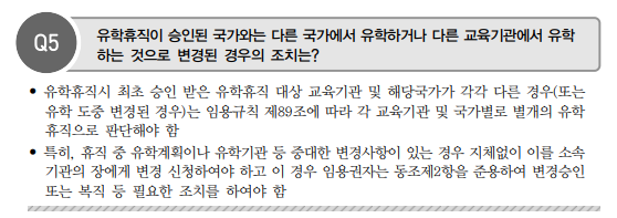 * 휴직 중인 공무원은 유학목적이 달성된 경우 지체없이 복직하여야 하며, 휴직 중 유학계획이나 유 학기관 등 중대한 변경사항이 있는 경우 소속기관의 장에게 변경 신청, 이 경우 임용권자는 신청 시와 동일한 기준으로 변경 승인 또는 복직 등 필요한 조치를 하여야 함