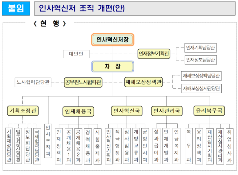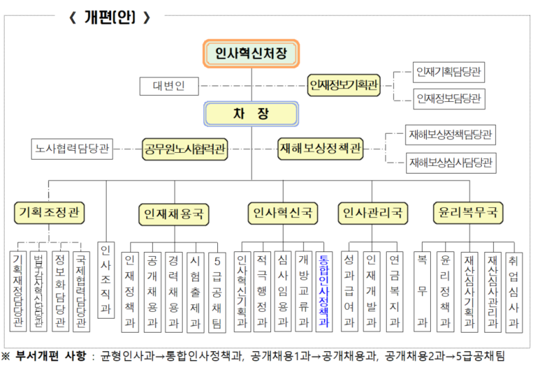 이번 인사처 조직개편은 공직사회 내 인적 다양성 확보와 포용적 문화조성, 정책 수요 반영 등 적극적·능동적 정책을 추진하고자 부서 개편 및 인력 재배치 등을 중심으로 진행된다.