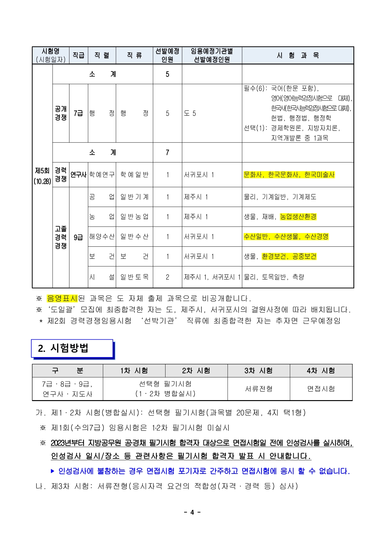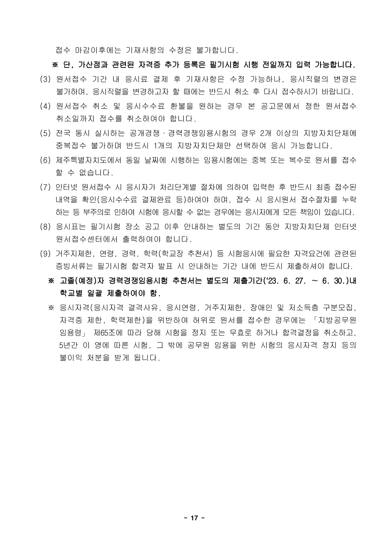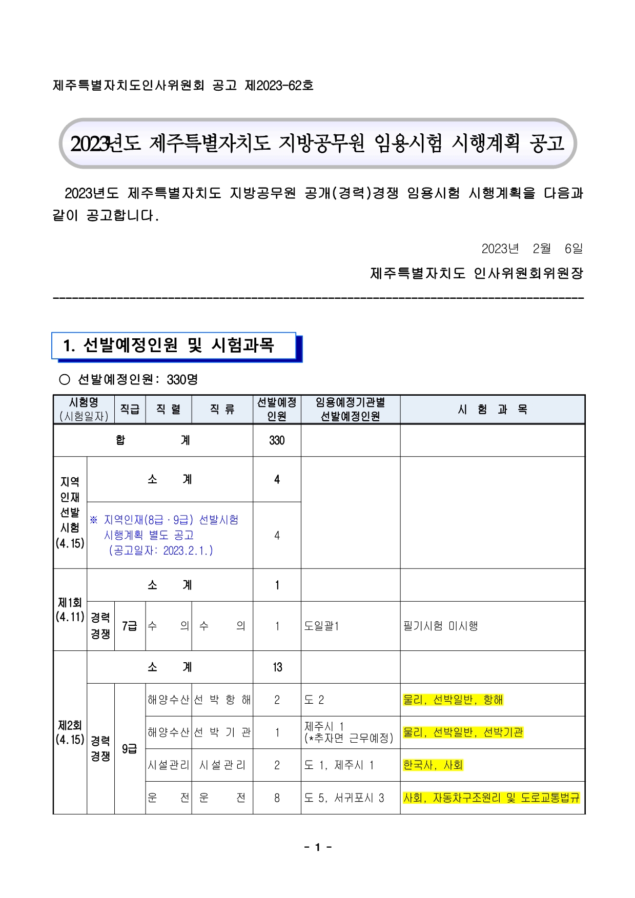 01.(인사위 공고 제62호) 2023년도 제주특별자치도 지방공무원 임용시험 시행계획 공고.hwp