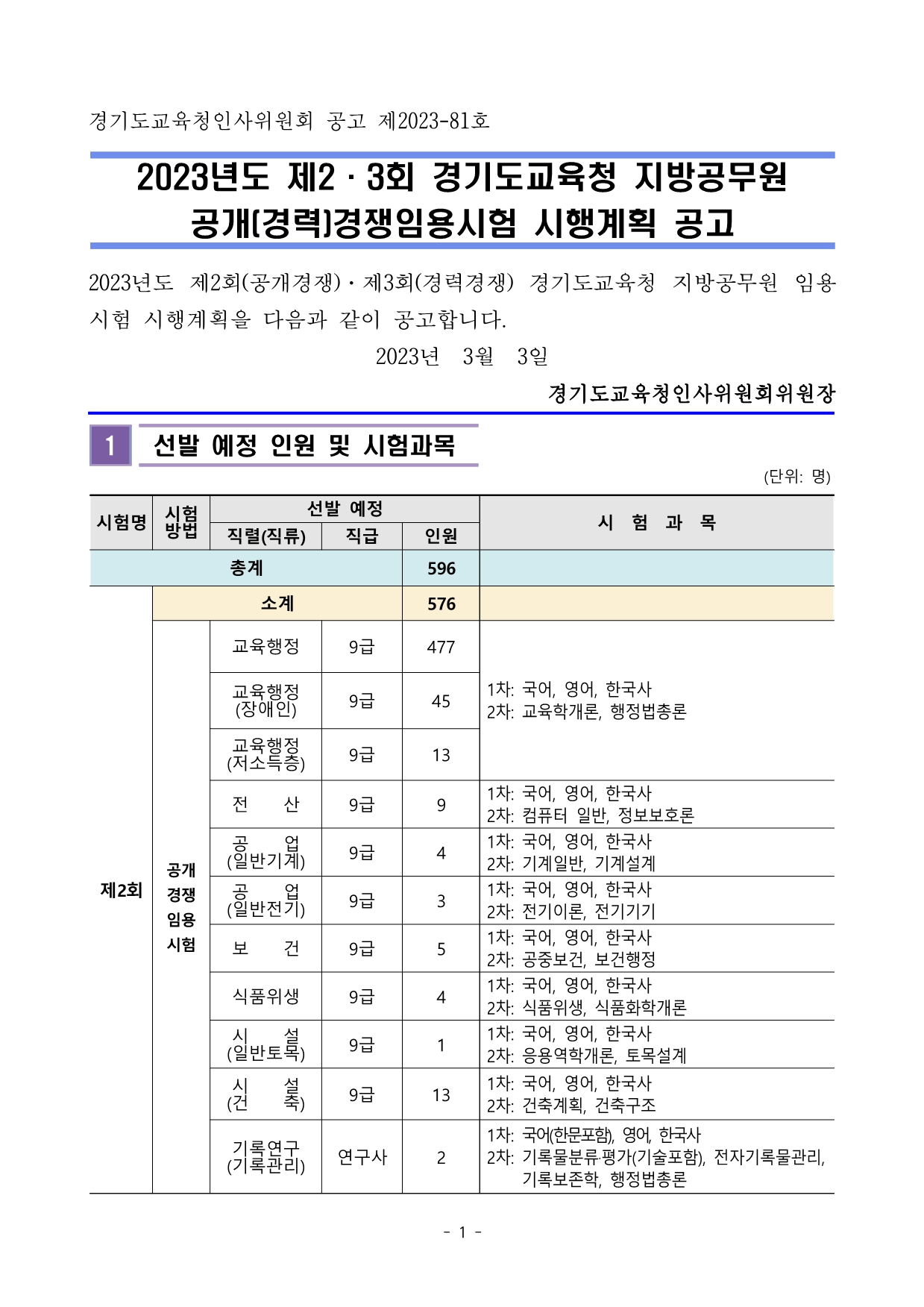 [공고문] 2023년도 제2·3회 경기도교육청 지방공무원 공개(경력)경쟁임용시험 시행계획 공고 (1).pdf