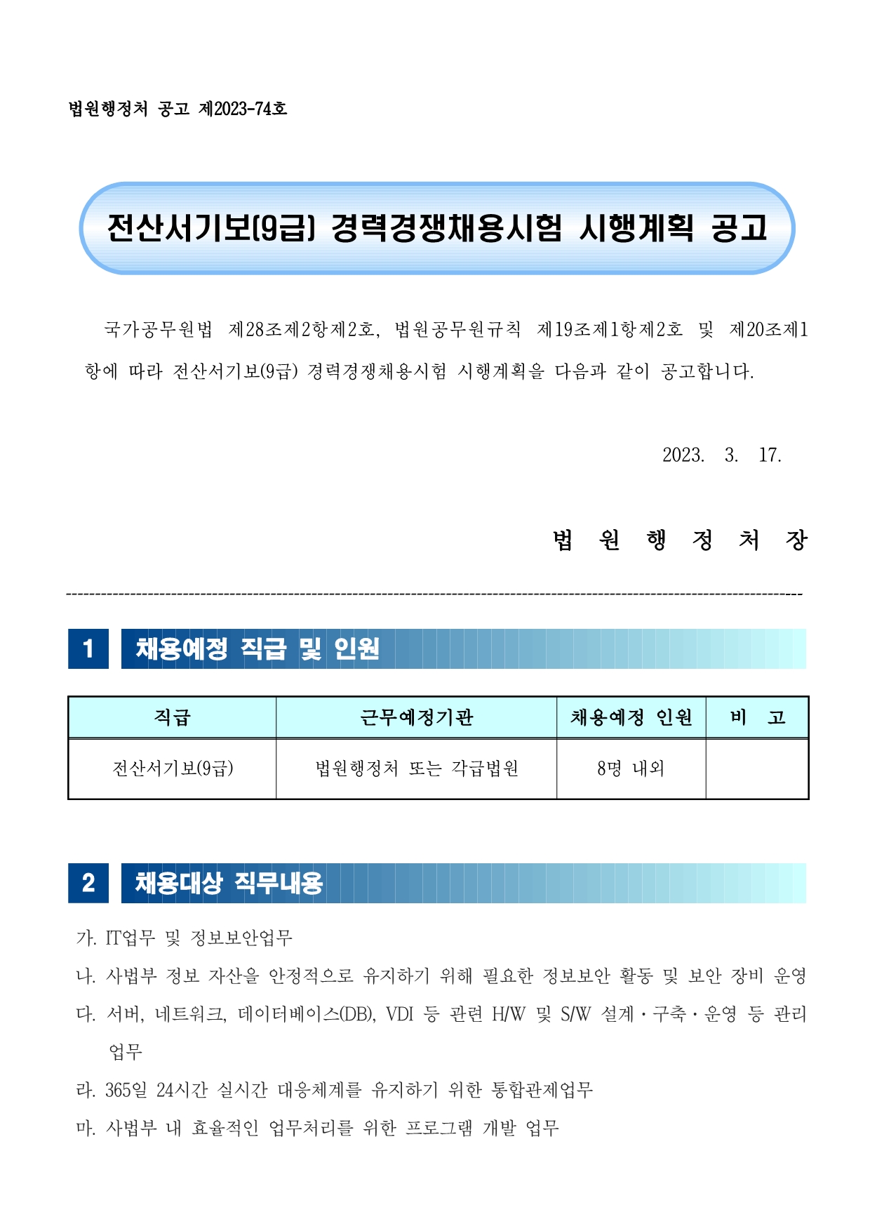 | 2023년 고등법원 속기직 경력경쟁 공무원 시험 공고 (0) | 2023.03.28 |