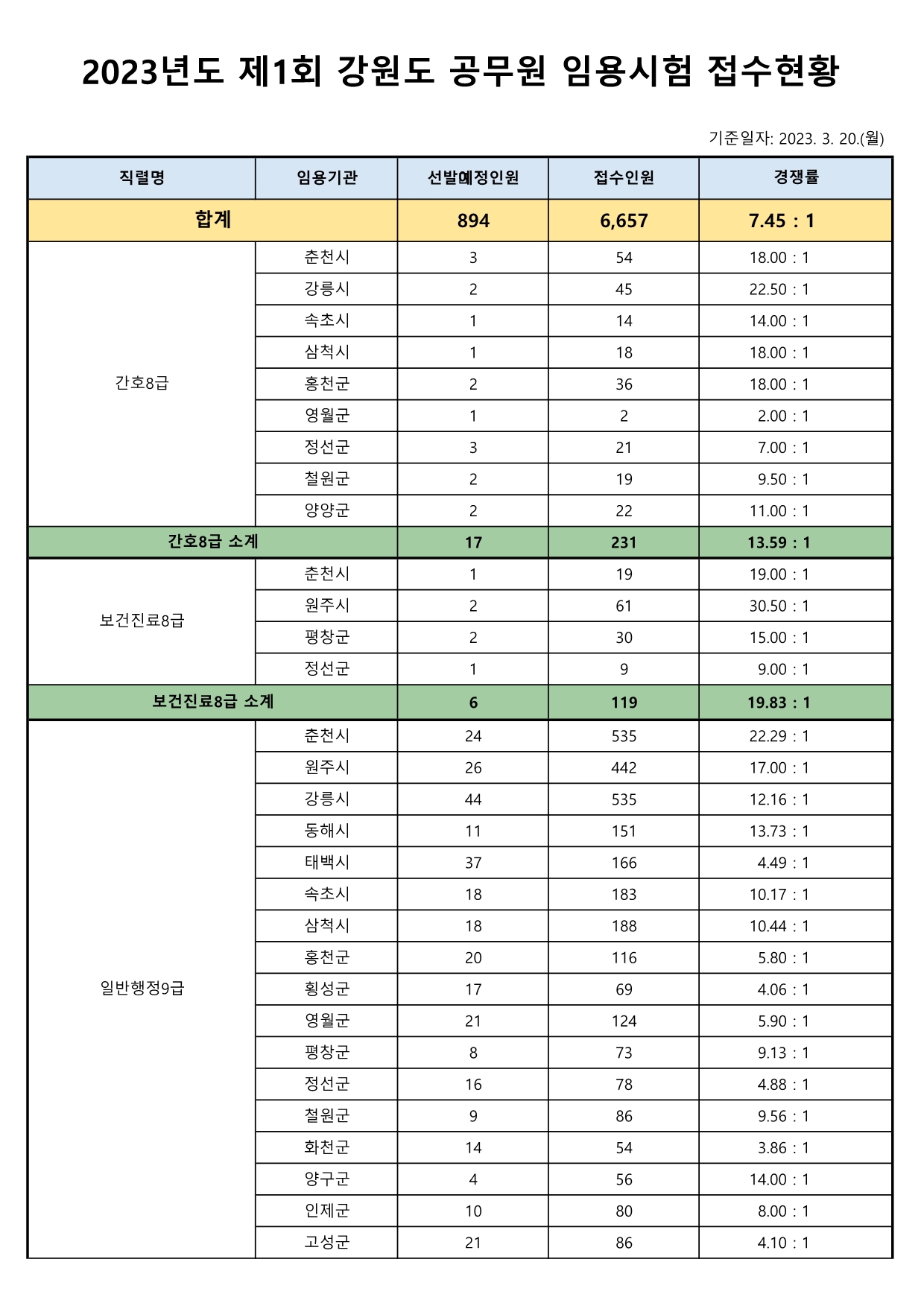 | [경쟁률]2023년 광주광역시 9급 공무원 시험 경쟁률(8급포함) (0) | 2023.03.21 |