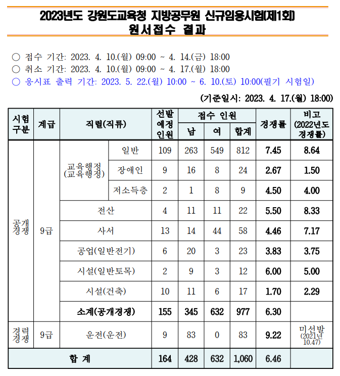 | 2023년 전라북도 교육청 공무원 시험 경쟁률 (0) | 2023.04.18 |