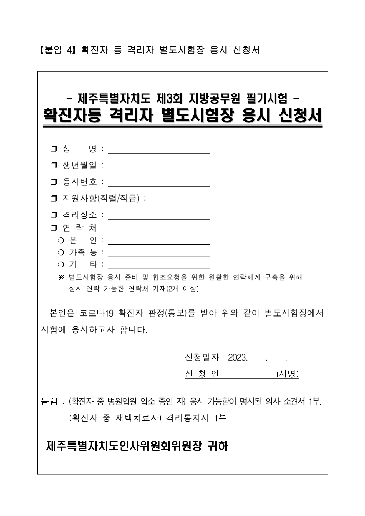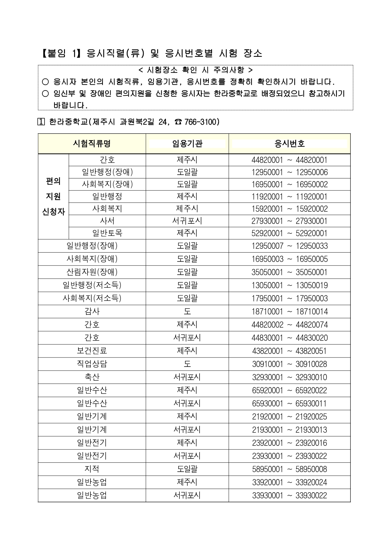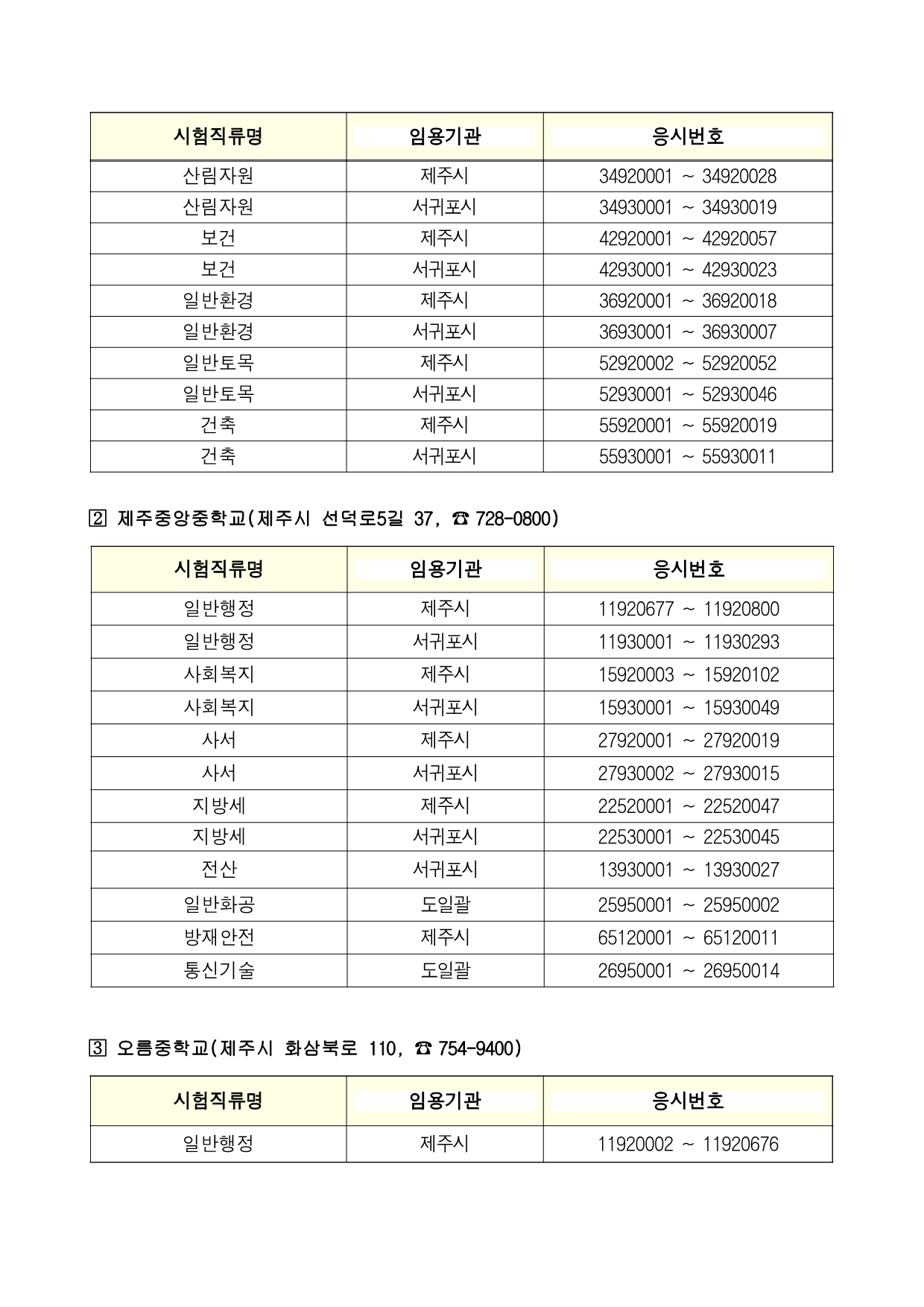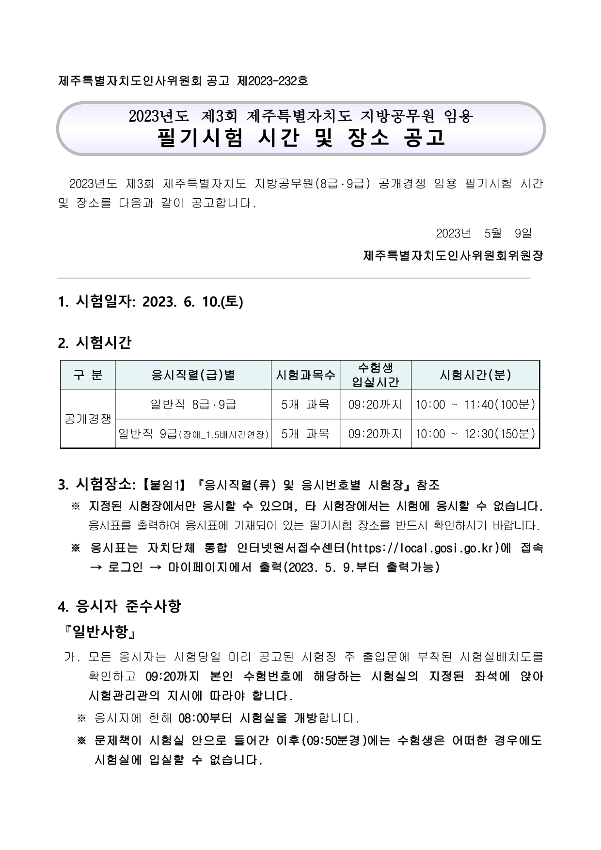 01.(인사위 공고-232호) 제주특별자치도 제3회 지방공무원 공개경쟁임용 필기시험 시간 및 장소 공고문.hwp