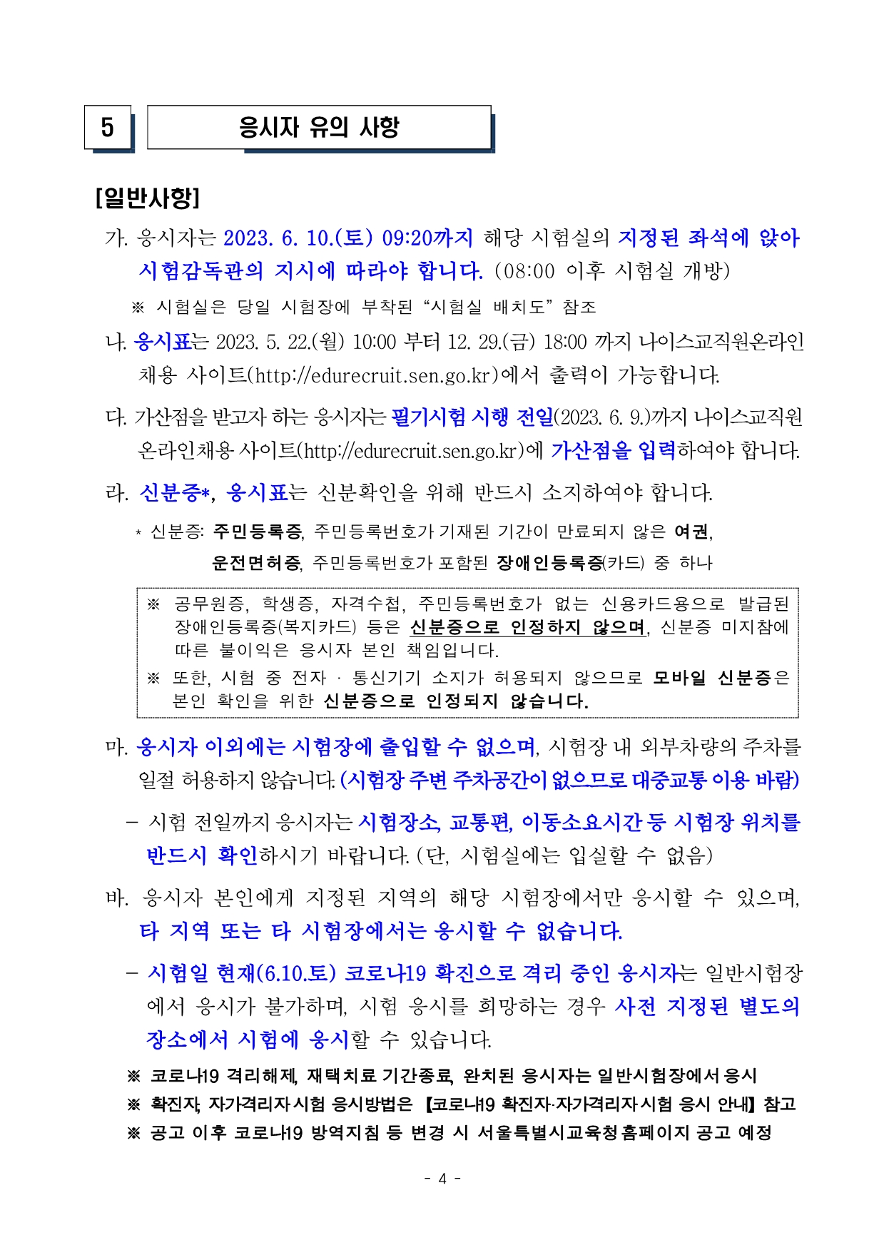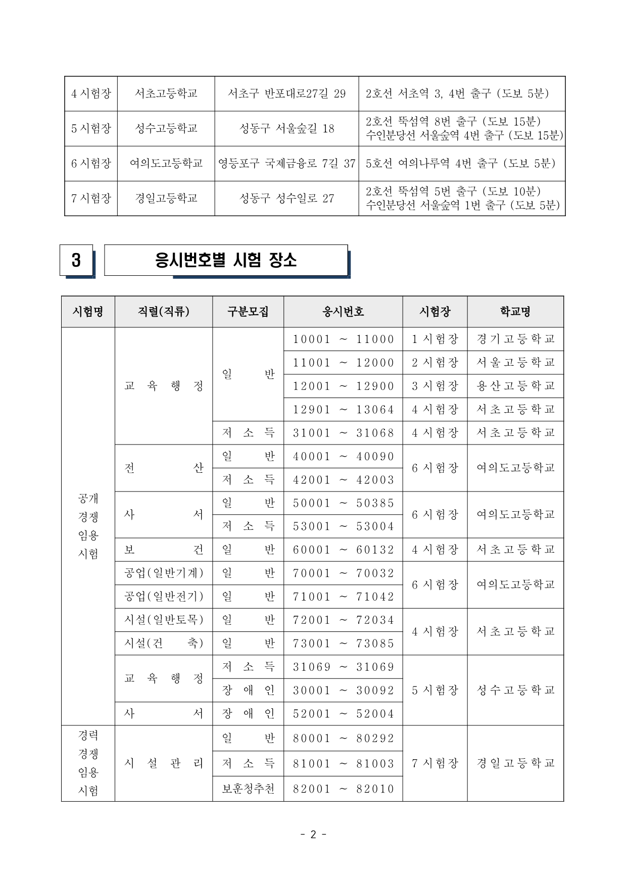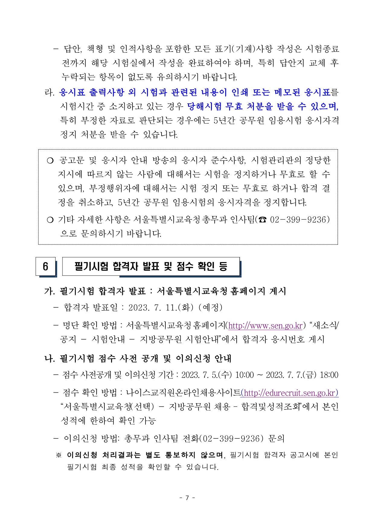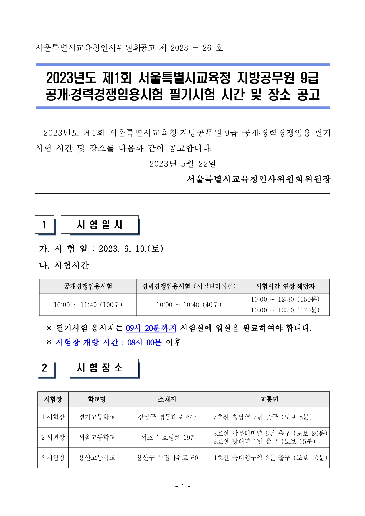 (공고) 2023년도 제1회 서울특별시교육청 지방공무원 9급 공개경력경쟁임용 필기시험 시간 및 장소 공고.hwp