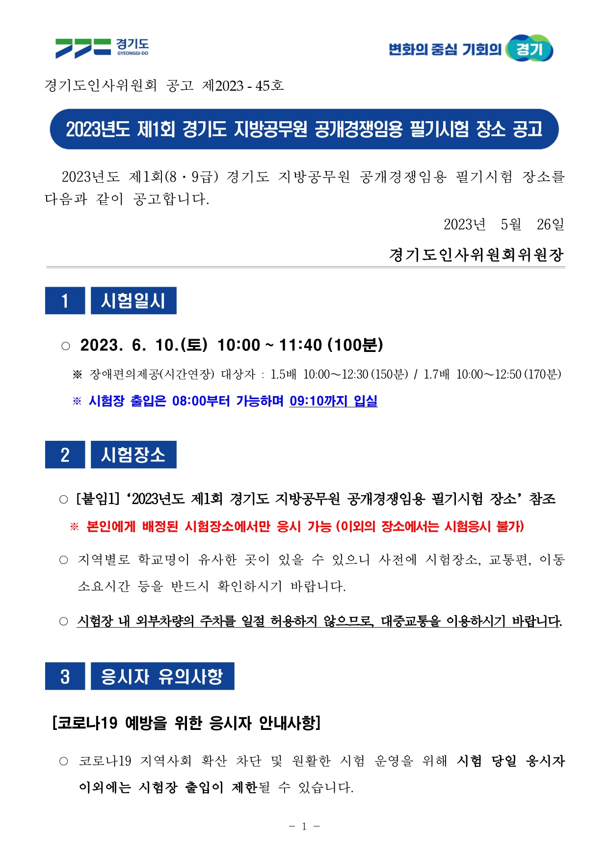 2023년도 제1회 경기도 지방공무원 공개경쟁임용 필기시험 장소 공고.pdf