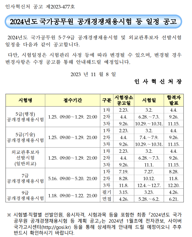 한편, 시험·직렬별 선발 예정 인원과 시험과목, 응시 자격 등 구체적인 시험 정보는 내년 1월 초 인사처 누리집(www.mpm.go.kr) 및 사이버국가고시센터 등을 통해 공고할 예정이다.