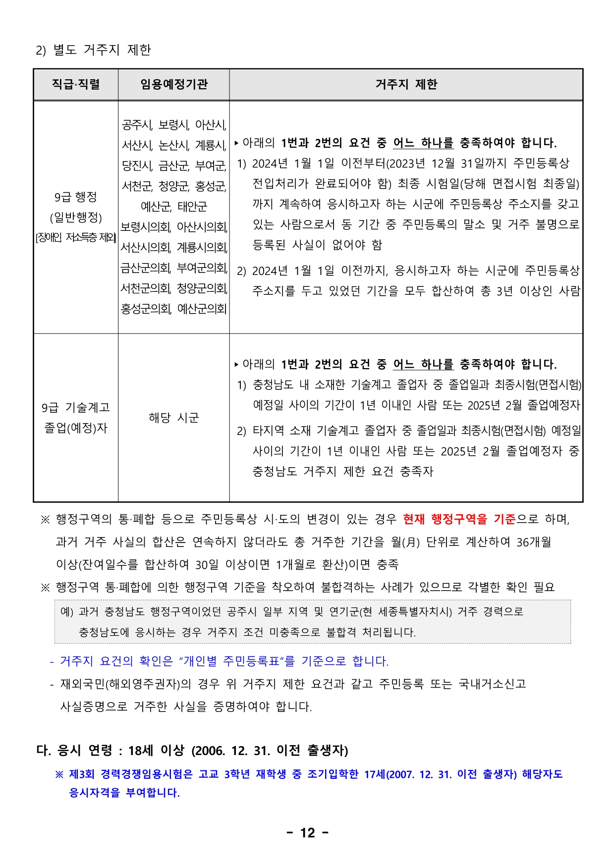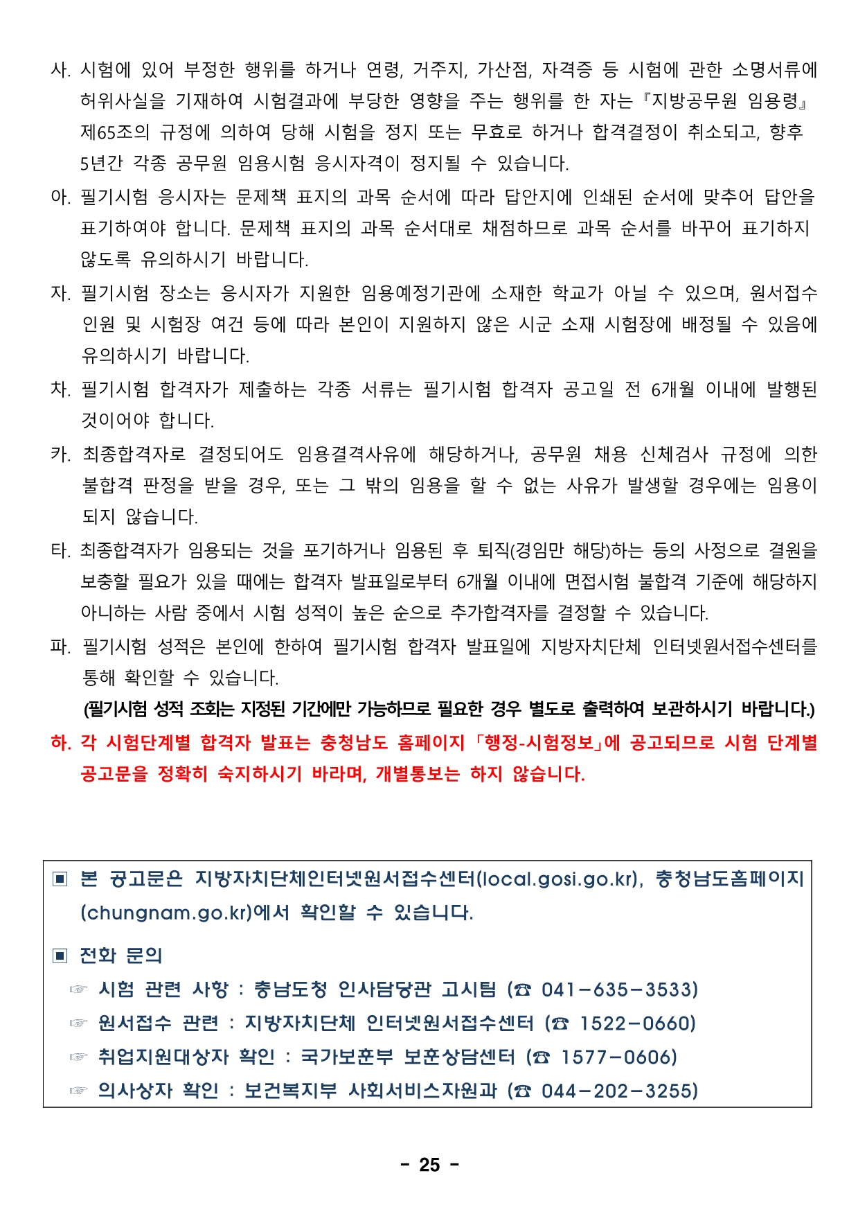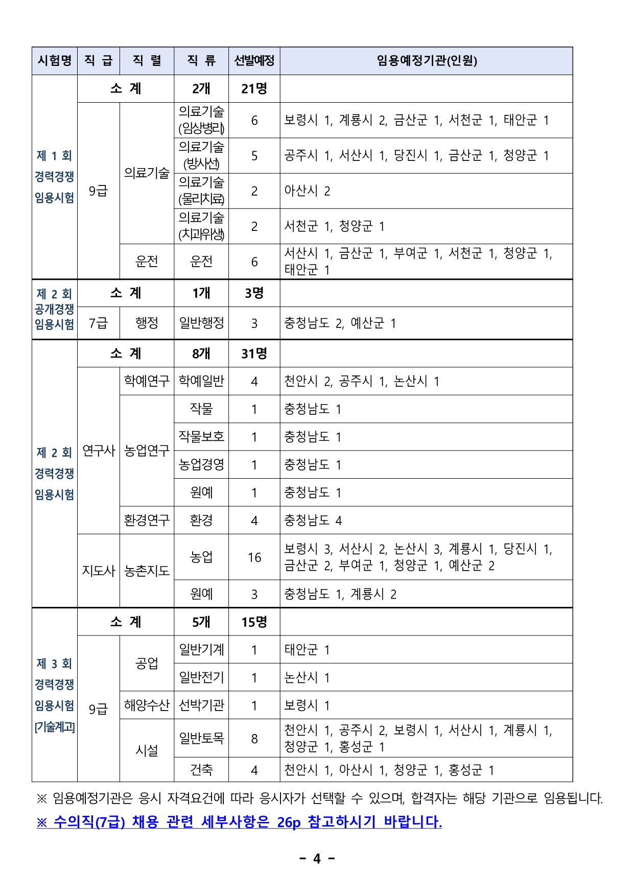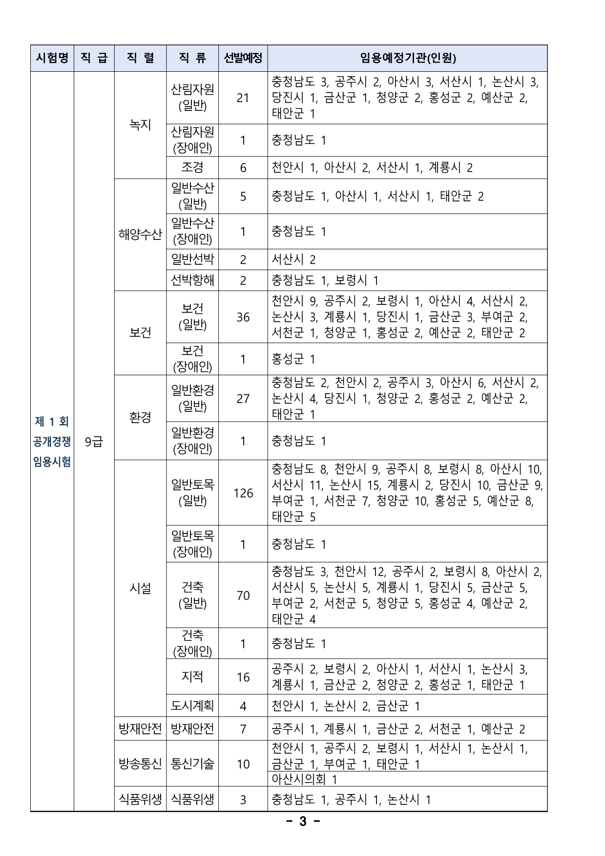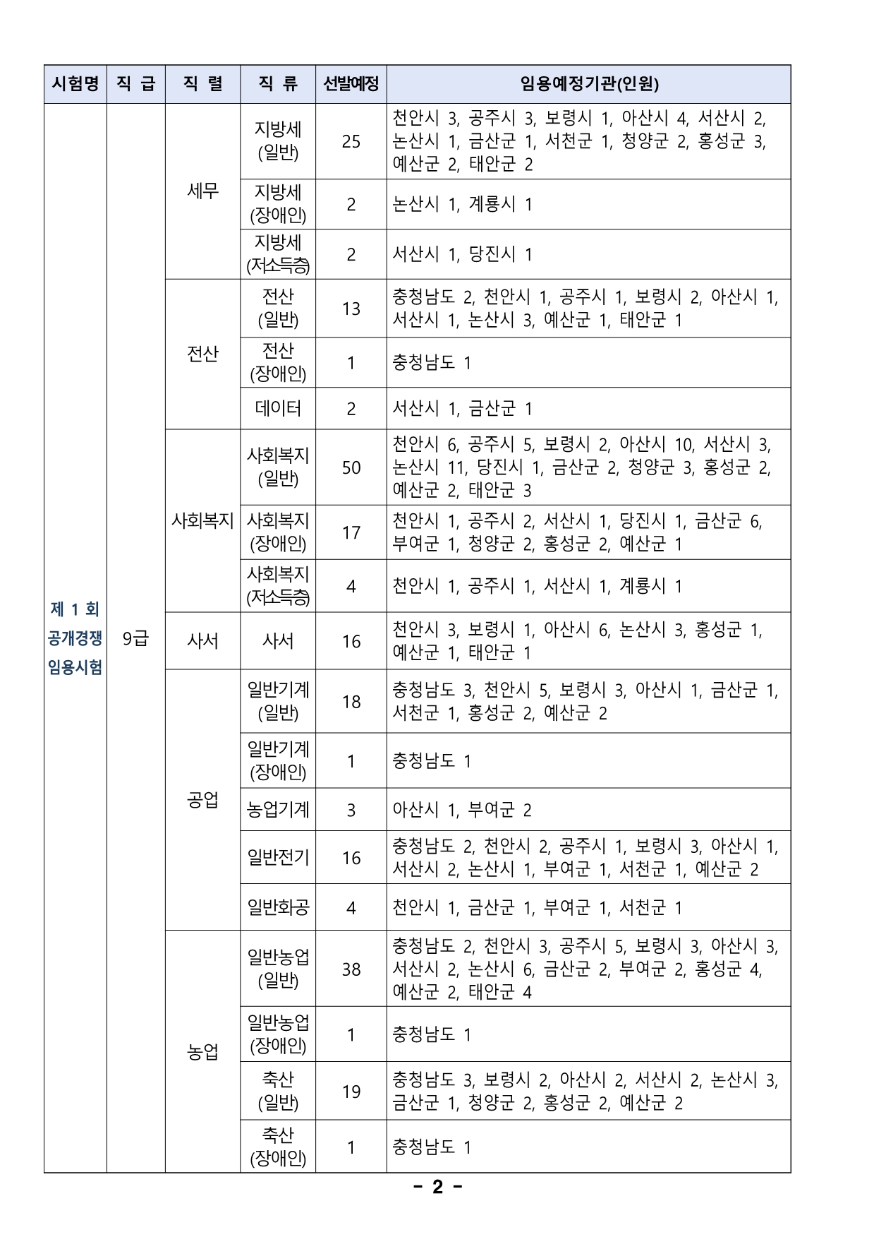 8급 | 간호 | 간호 | 46 | 47 | 천안시 9, 공주시 6, 보령시 4, 아산시 5, 서산시 2, 논산시 2, 금산군 1, 부여군 7, 서천군 2, 청양군 3(2→3), 홍성군 2, 예산군 3, 태안군 1 |