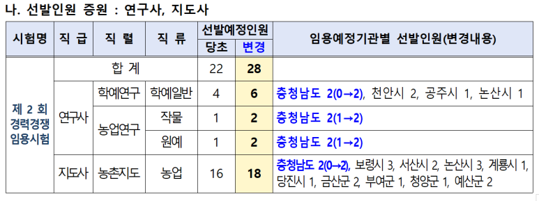 | 시험명 | 직 급 | 직 렬 | 직 류 | 선발예정인원 | 임용예정기관별 선발인원(변경내용) | |