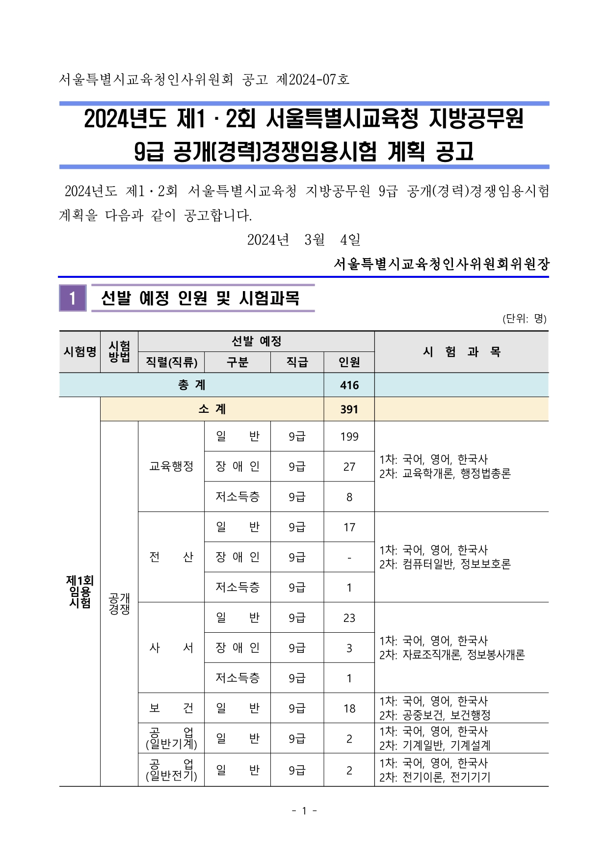 2024년도 제1_2회 서울특별시교육청 지방공무원 9급 공개(경력)경쟁임용시험 계획 공고(서울특별시교육청인사위원회 공고 제2024-07호) (1).hwp