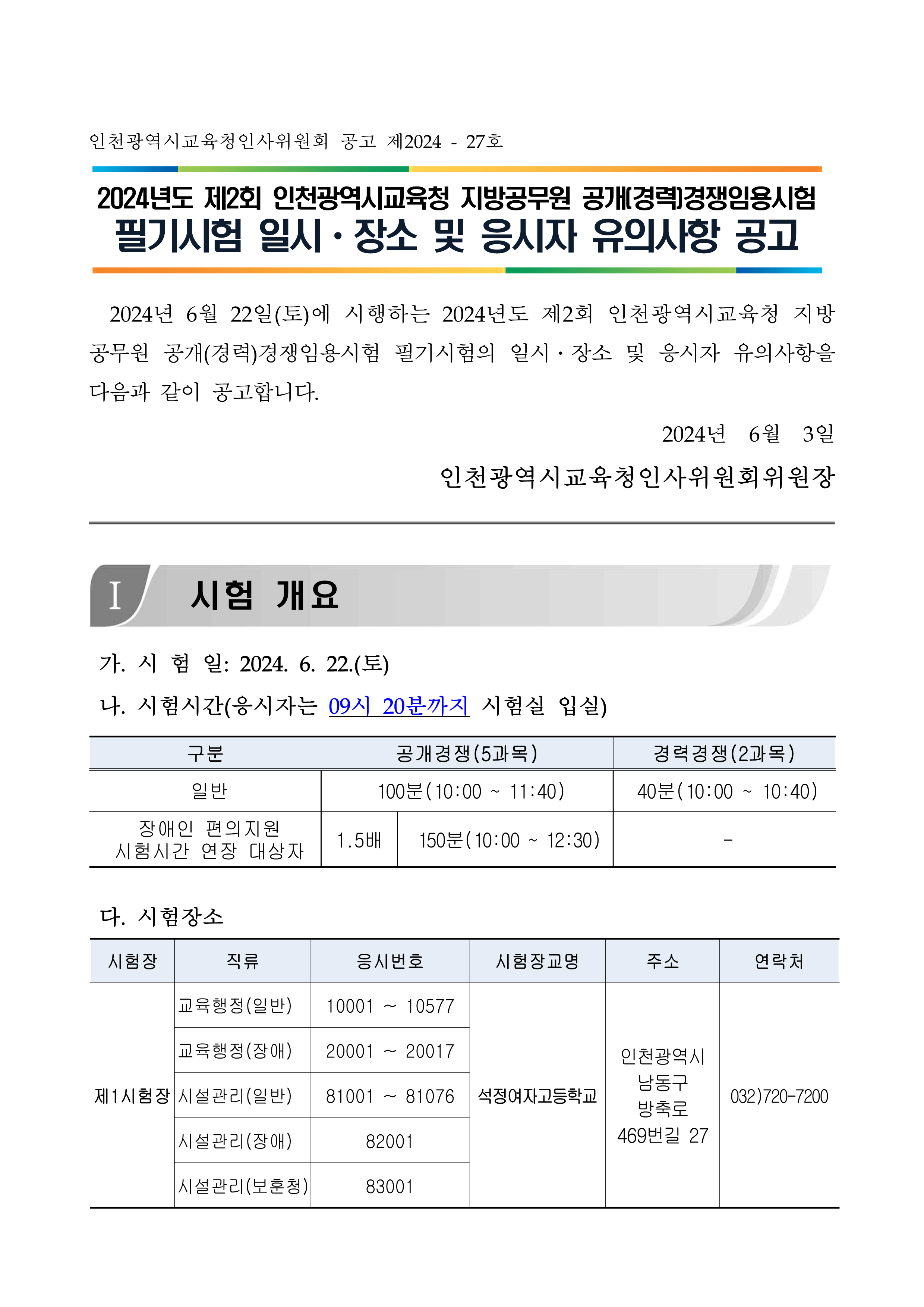 | 2024년 서울특별시교육청 공무원 시험 장소공고 (0) | 2024.06.03 |