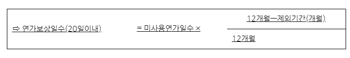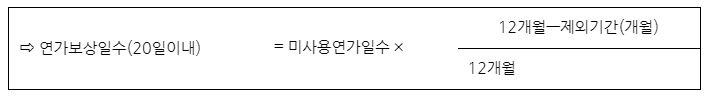 나)제외기간은 연도 중 지급대상에서 제외되는 기간을 말한다. 각 제외기간은 합산하여 개월 수로 환산하여 계산하되, 15일 이상인 경우 1개월로 계산하고, 15일 미만은 계산하지 않는다. 산식에 따라 산출된 연가보상일수는 소수점 이하 첫째 자리에서 절상한다.