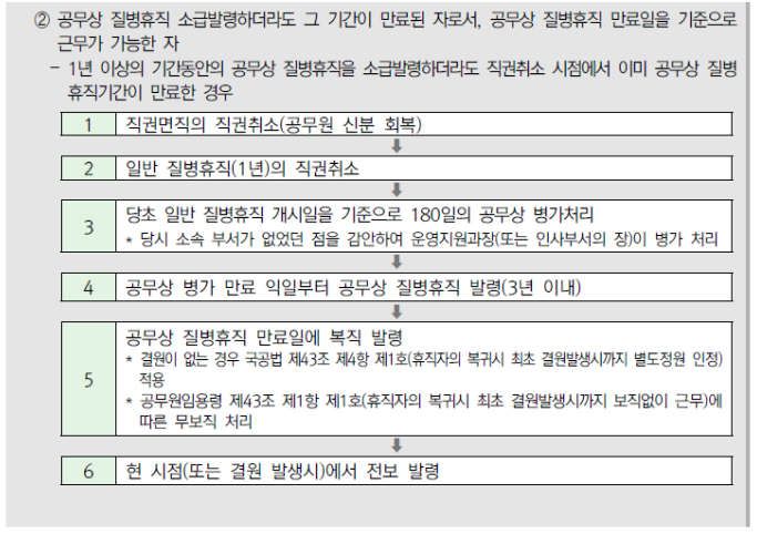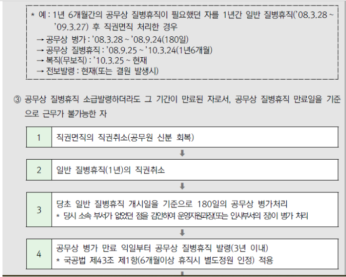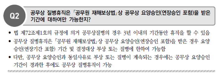 다만, 공무상요양승인과 동일사유로 질병 또는 부상이 계속되는 경우에는 공무상요양승인기간 경과한 후에도 공무상질병휴직이 가능