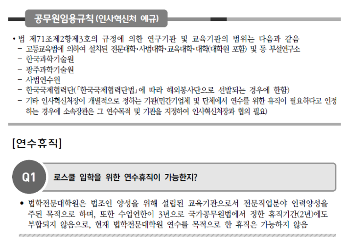 ○ 휴직사유 : 중앙인사관장기관의 장이 지정하는 연구기관이나 교육기관 등에서 연수하게