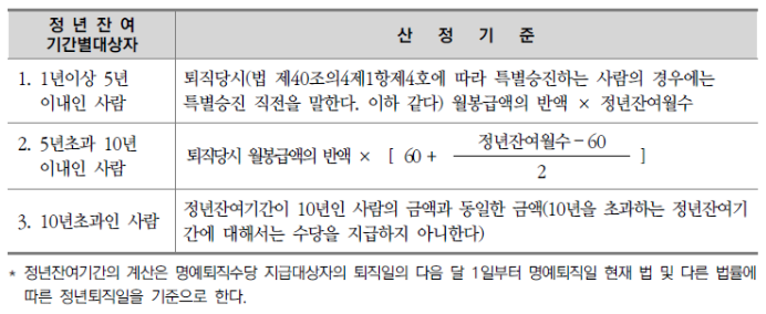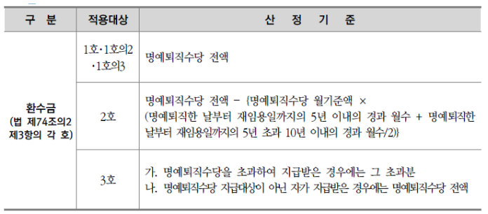 지급기준 : 재임용시 환수금액(이자 제외) {명예퇴직수당 월기준액 × (명예퇴직한 날부터 5년 이내의 재임용 후 근무 월수 + 명예퇴직한 날부터 5년 초과 10년 이내의 재임용 후 근무 월수/2)}